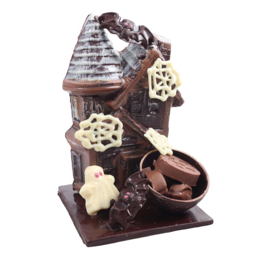 Transformez votre maison en un véritable lieu de frissons avec cette maison hantée spécialement conçue pour Halloween. Cette pièce maîtresse de chocolat noir et lait est dotée de détails réalistes et effrayants : des petites toiles d'araignée en chocolat blanc, une chauve-souris en chocolat noir mais aussi un fantôme en chocolat blanc. D'autres surprises maléfiques vous attendent.