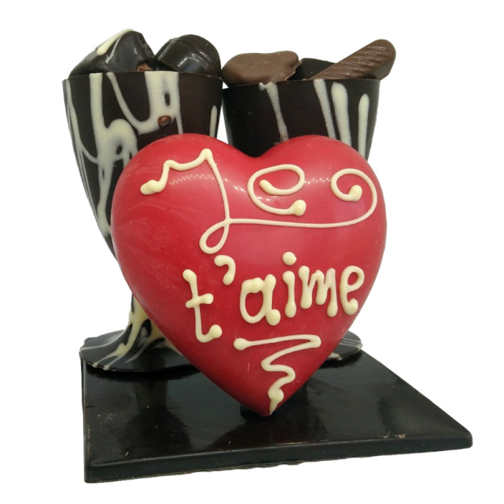 Quoi de plus original pour une soirée romantique en tête à tête? Avec ces coupes de champagne 100% chocolat, vous pourrez trinquer à votre amour et savourer langoureusement ce bel instant de gourmandise. Régalez-vous avec notre chocolat noir 72% de cacao, ce grand coeur en chocolat blanc et notre garniture de ganaches et de pralinés aux trois chocolats. Attention... N'oubliez pas de trinquer dans les yeux!