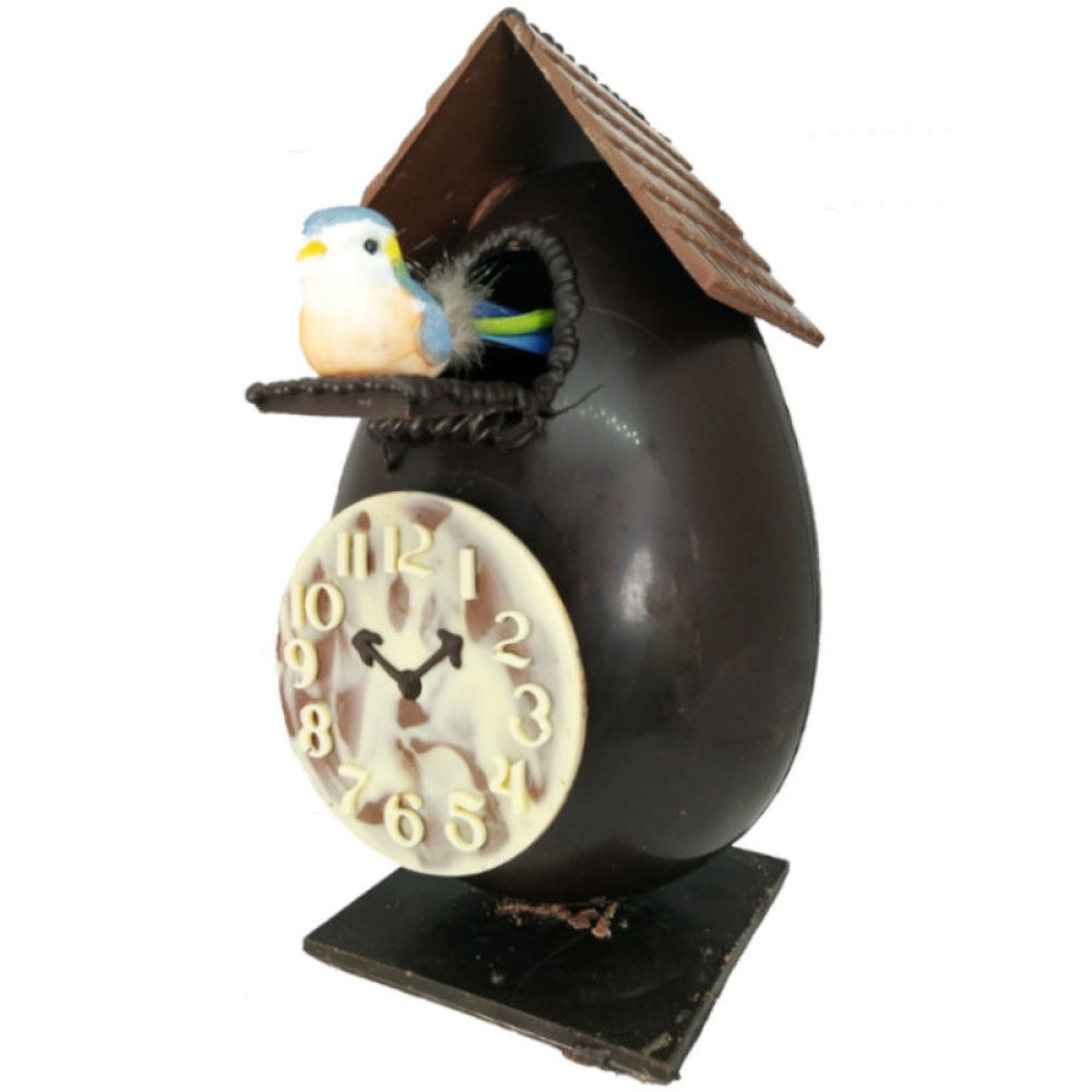 Véritable mécanisme à croquer ! Cette année, découvrez notre horloge coucou en forme d’œuf de Pâques ! Une création unique composée d’un cadran, d’un toit, d’une base et d’un œuf au chocolat au lait. Sans oublier le petit moineau qui sonne l’heure ! Impossible de ne pas y goûter !
