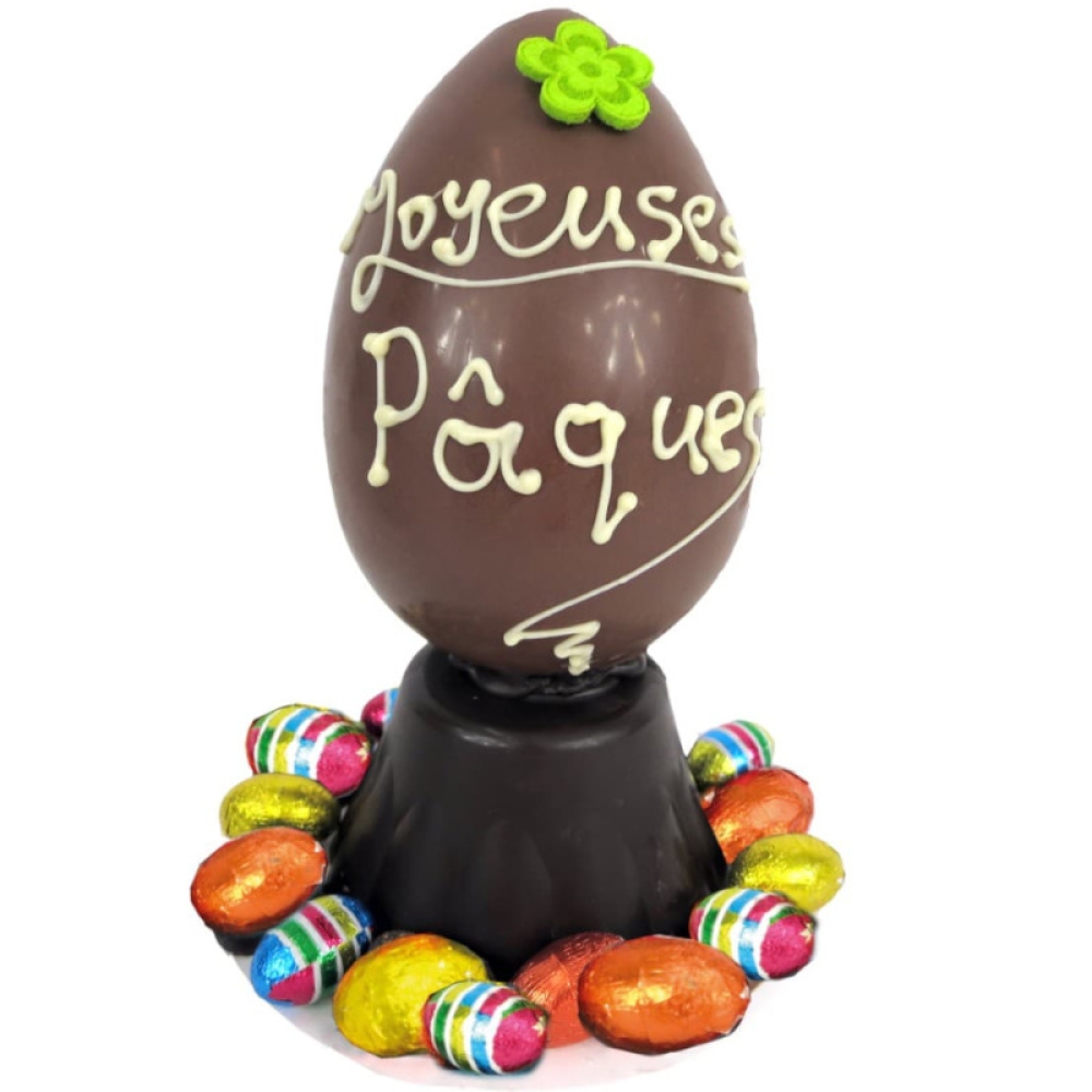 Parmi nos délicieux œufs classiques, retrouvez ce savoureux œuf au chocolat au lait, garni de ses petits œufs de Pâques (ganache noire, fraise, dulcey et caramel) ! Montée sur une base au chocolat noir, 72% de cacao, cette création en séduira plus d’un !