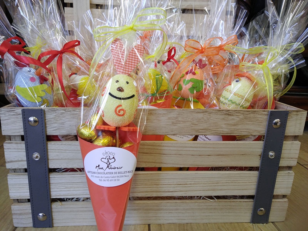 Envie de cacher des petits oeufs dans le jardin? Avec ces cônes de Pâques, vos enfants seront ravis! En plus de découvrir 15 petits oeufs de chocolat noir et au lait fourrés au praliné, ils auront la surprise de trouver un adorable petit bonhomme de Pâques! Lapin, coq, poulette... Un sujet qu'ils pourront conserver en souvenir du bon chocolat qu'ils auront dégusté!