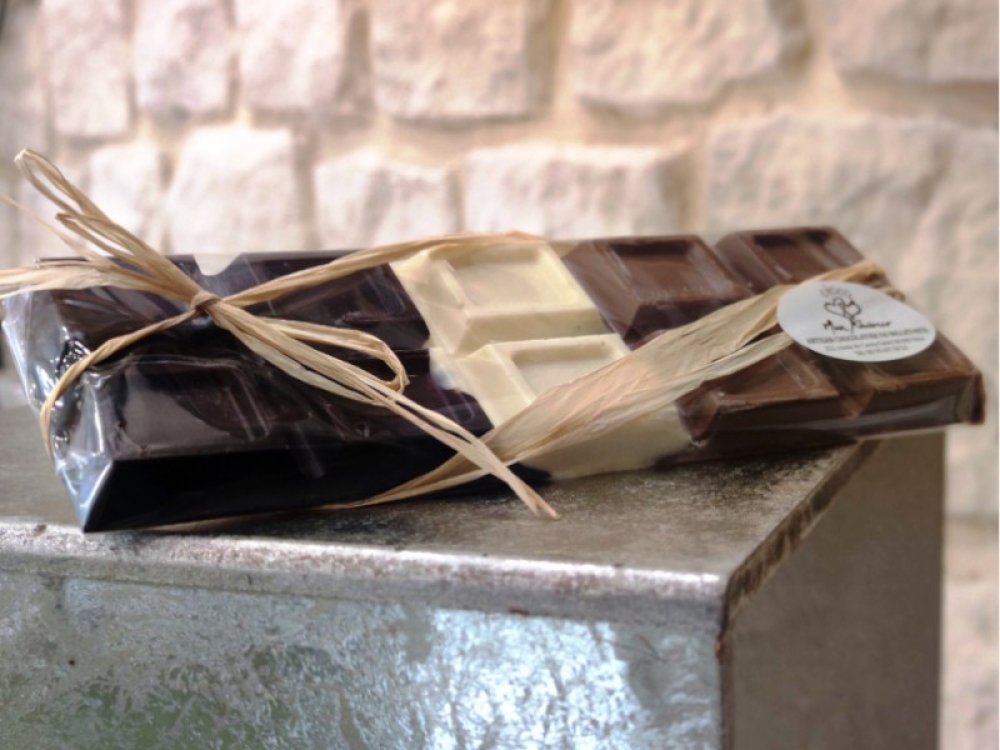 Ingrédients: chocolat noir 72% cacao (pâte de cacao, sucre, beurre de cacao, émulsifiant : lécithine de soja, extrait naturel de vanille), chocolat au lait (pâte de cacao, sucre, lait entier en poudre, beurre de cacao, émulsifiant: lécithine de soja, extrait naturel de vanille), chocolat blanc (sucre, lait entier en poudre, beurre de cacao, émulsifiant : lécithine de soja, extrait naturel de vanille).