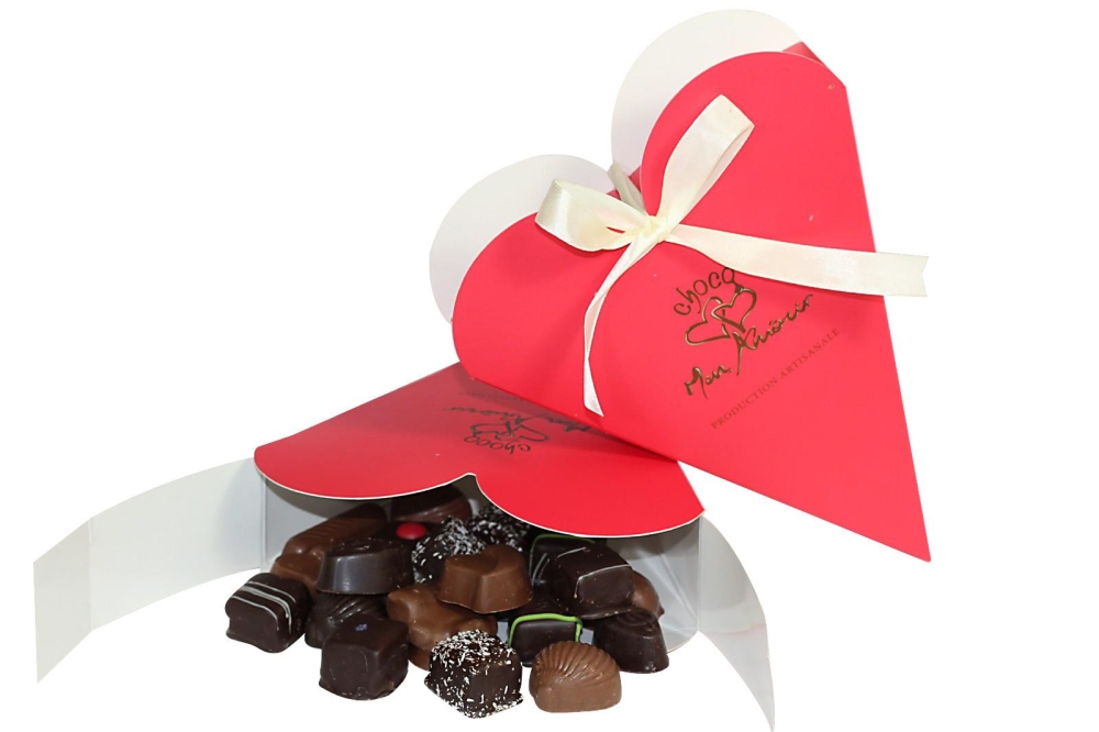 Pour la fête des amoureux, craquez pour la fameuse boîte en forme de cœur et son assortiment 100% artisanal de ganaches, pralinés, pâtes d’amandes et fruits secs enrobés de chocolat noir 72% de cacao, chocolat au lait et blanc.