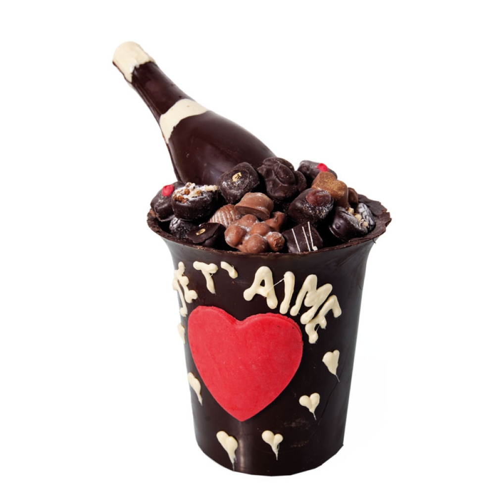 Pour les plus gourmands, nous vous proposons notre grand seau, une délicieuse création au chocolat noir 72% de cacao. Vous aurez les yeux plus gros que le ventre en voyant sa grande bouteille de champagne chocolatée et son assortiment débordant de ganaches, pralinés, pâtes d’amandes et fruits secs ! Deux fois plus d’amour et de chocolats !