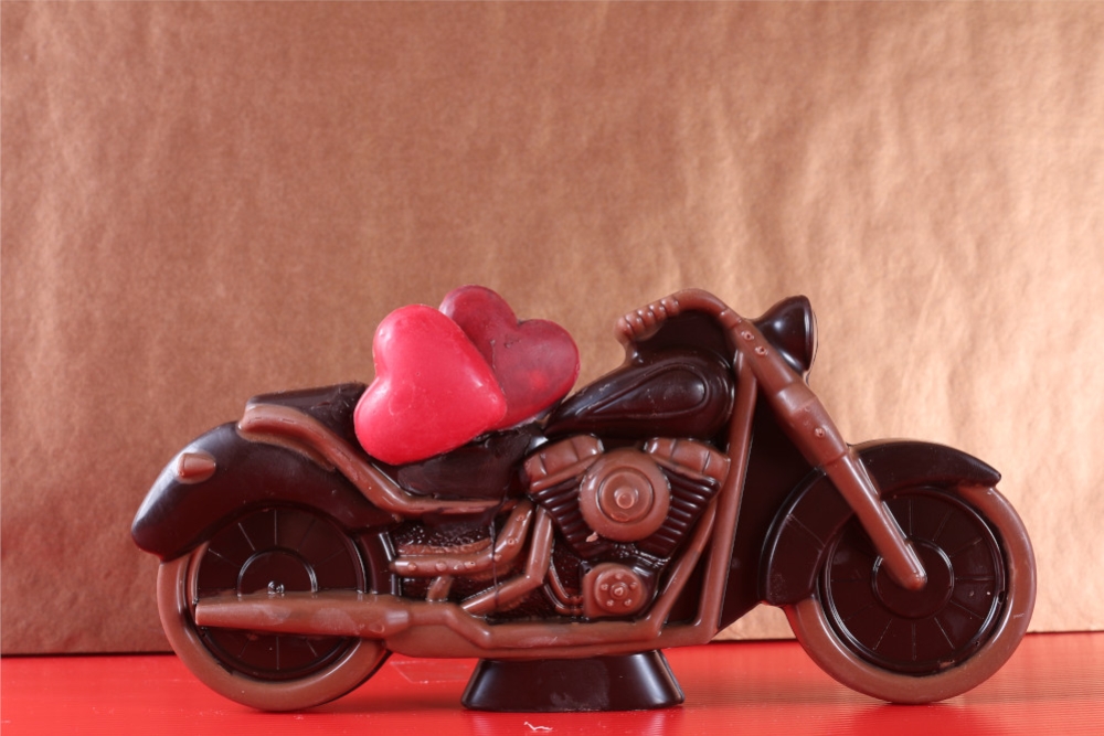 Pas besoin de tester la performance de son moteur! Chez Choco Mon Amour, c'est l'esthétique et le goût qui prime! Faites place à la tendance du moment avec cette ravissante moto et laissez- vous subjuguer par la tendresse de ce chocolat noir 72% de cacao délicatement décoré de chocolat au lait.
