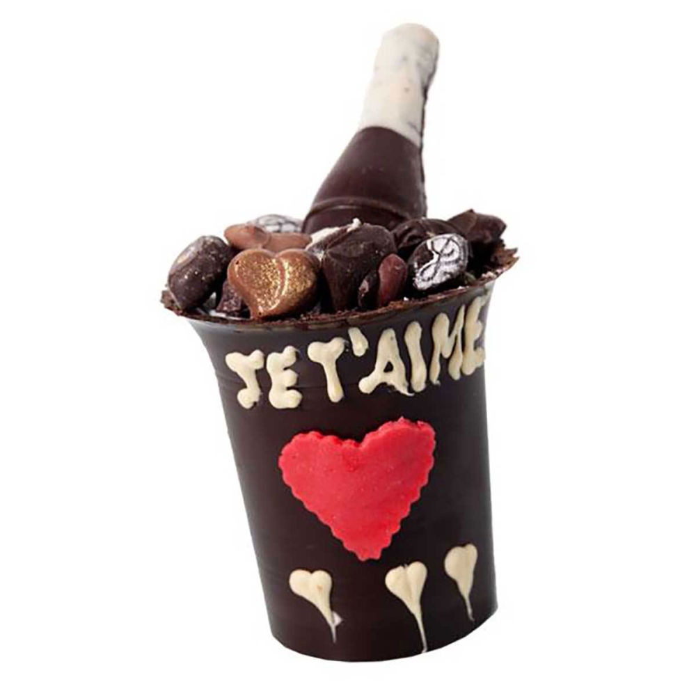 Et si vous trinquiez en chocolat cette année ? Pour la Saint-Valentin, faites preuve d’originalité avec cette belle création en chocolat noir, composée d’un seau et de son mot d’amour. Vous y trouverez à l’intérieur une bouteille de champagne et son assortiment de bonbons aux trois chocolats. Difficile d’y résister !