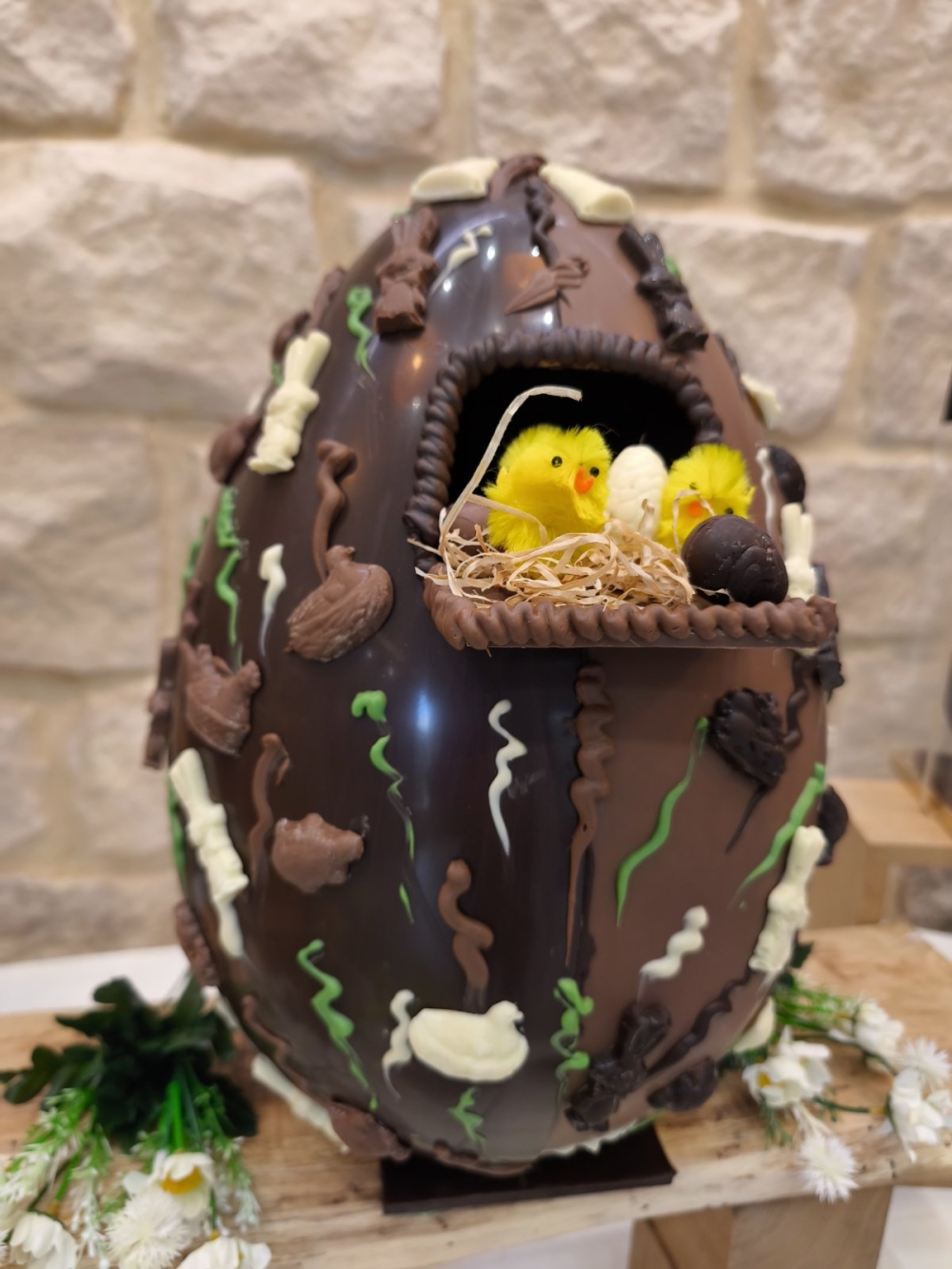 Envie d'épater votre famille avec une fabuleuse création géante!!! Surprenez vos enfants avec cette délicieuse composition en chocolat noir 72% ou chocolat au lait. Décoré avec grande précision et embelli de multiples motifs colorés de Pâques, cet oeuf sublimera vos tables de fête et donnera vie à la basse-cour tant convoitée de vos petits !