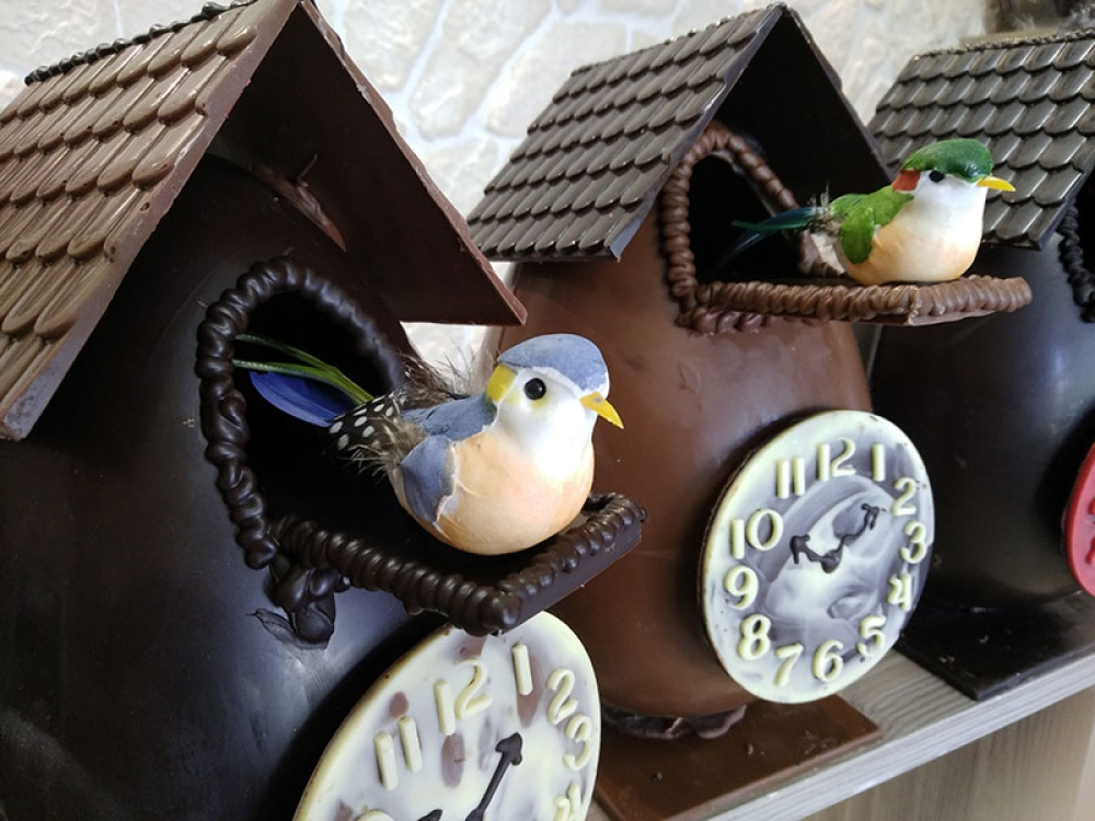 Véritable mécanisme à croquer ! Cette année, découvrez notre horloge coucou en forme d’œuf de Pâques ! Une création unique composée d’un cadran, d’un toit, d’une base et d’un œuf au chocolat au lait. Sans oublier le petit moineau qui sonne l’heure ! Impossible de ne pas y goûter !