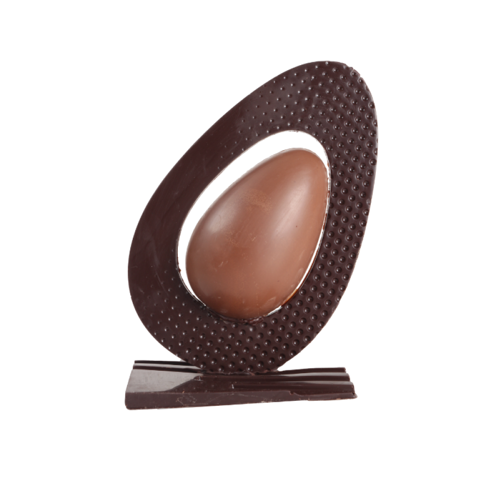 Son secret ? Un œuf en chocolat au lait fondant, délicatement posé au cœur d’une structure en chocolat noir graphique. C’est beau, c’est bon… et c’est fait à la main, dans notre atelier à Nice.