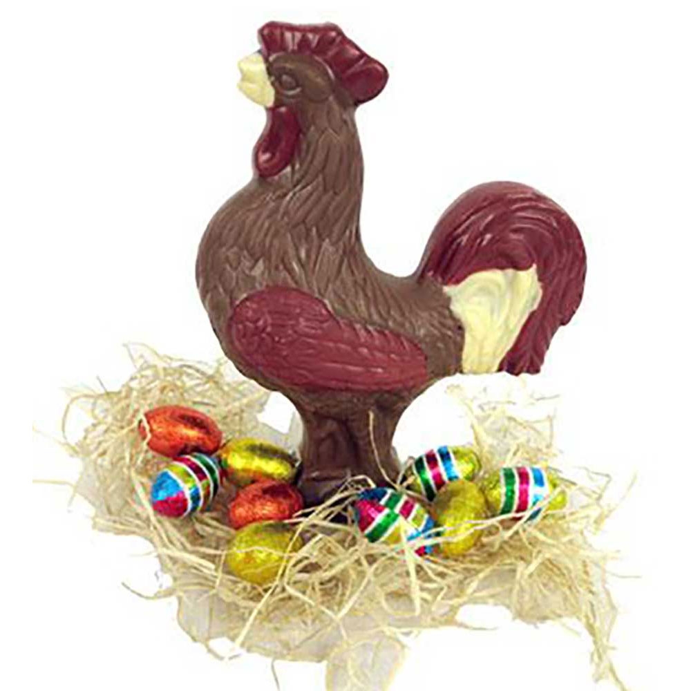 Retour à notre basse-cour savoureuse et son coq en chocolat au lait fondant en bouche. Posé sur un petit nid de paille, vous trouverez à ses pattes de délicieux petits œufs pralinés ! Également disponible en chocolat noir.
