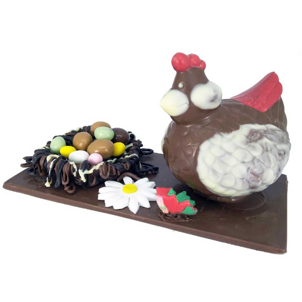 Entendez-vous cette petite poule glousser ? Pâques est arrivé ! Cette savoureuse création nous le confirme. Laissez-vous tenter par cette sublime poule au lait et son petit nid garni de petits œufs de Pâques.