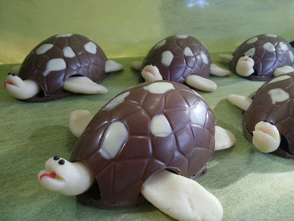 Pour ceux qui préfèrent les créations 100% originales, nous vous proposons cette adorable petite tortue de Pâques, composée d’une carapace croquante au chocolat au lait et tachetée de chocolat blanc. Modelé avec de la pâte d’amande, vous ne pourrez résister à son corps moelleux en bouche !